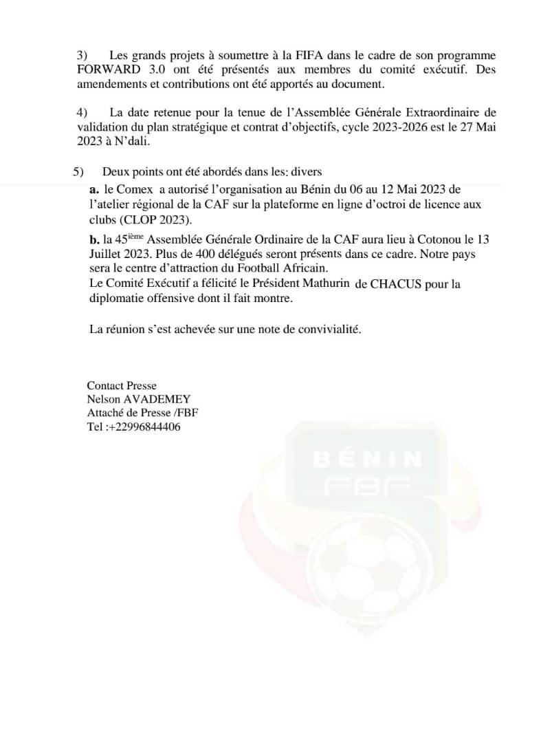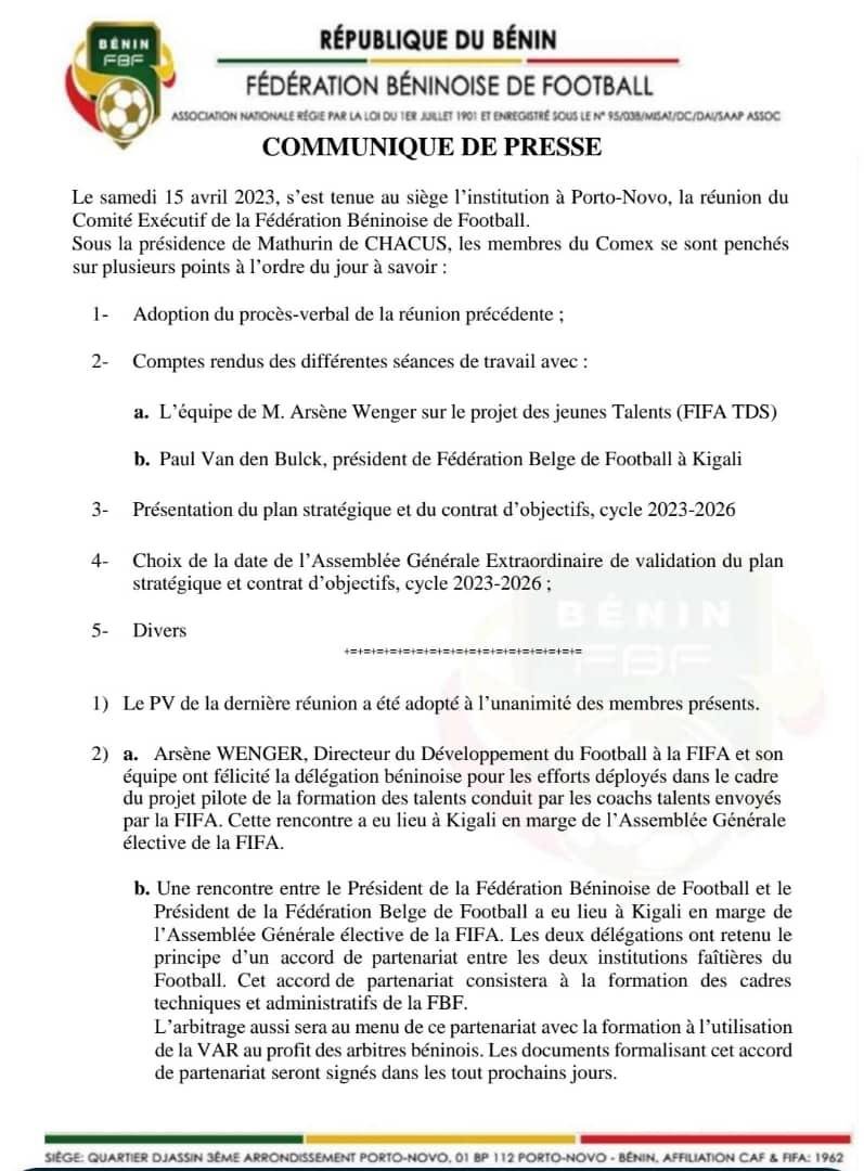 Le Comité Exécutif de la Fédération Béninoise de Football s’est réuni le samedi 15 avril 2023 à Porto-Novo. A travers un communiqué de presse, l’instance a fait le point de la séance que nous vous proposons de découvrir.