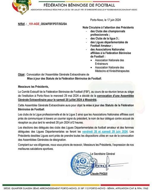 Dans une correspondance, la Fédération Béninoise de Football a annoncé que les clubs et associations membres, sont invités à soumettre le nom de leur délégué avant le 28 juin 2024 à 12 heures. Les élections des délégués se dérouleront les 28 et 29 juin 2024. Ces élections permettront de désigner les représentants qui participeront aux discussions et aux votes concernant les nouvelles modifications statutaires.