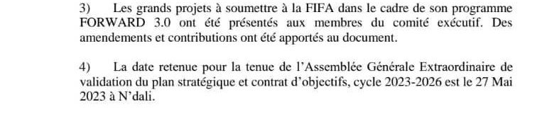 Dans un communiqué de presse, la Fédération Béninoise de football a fait le point sur la récente réunion des membres du comité exécutif, qui s’est tenue le samedi 15 avril 2023. Selon le communiqué, l’instance prépare une Assemblée Générale Extraordinaire dans les prochains jours. Cette Assemblée qui est prévue pour le 27 mai 2023 à N’dali va permettre au président Mathurin de-Chacus et ses paires de valider le plan stratégique et contrat d’objectifs, cycle 2023-2026. Un plan qui comporte les grands projets à soumettre à la FIFA, dans le cadre de son programme FORWARD 3.0.