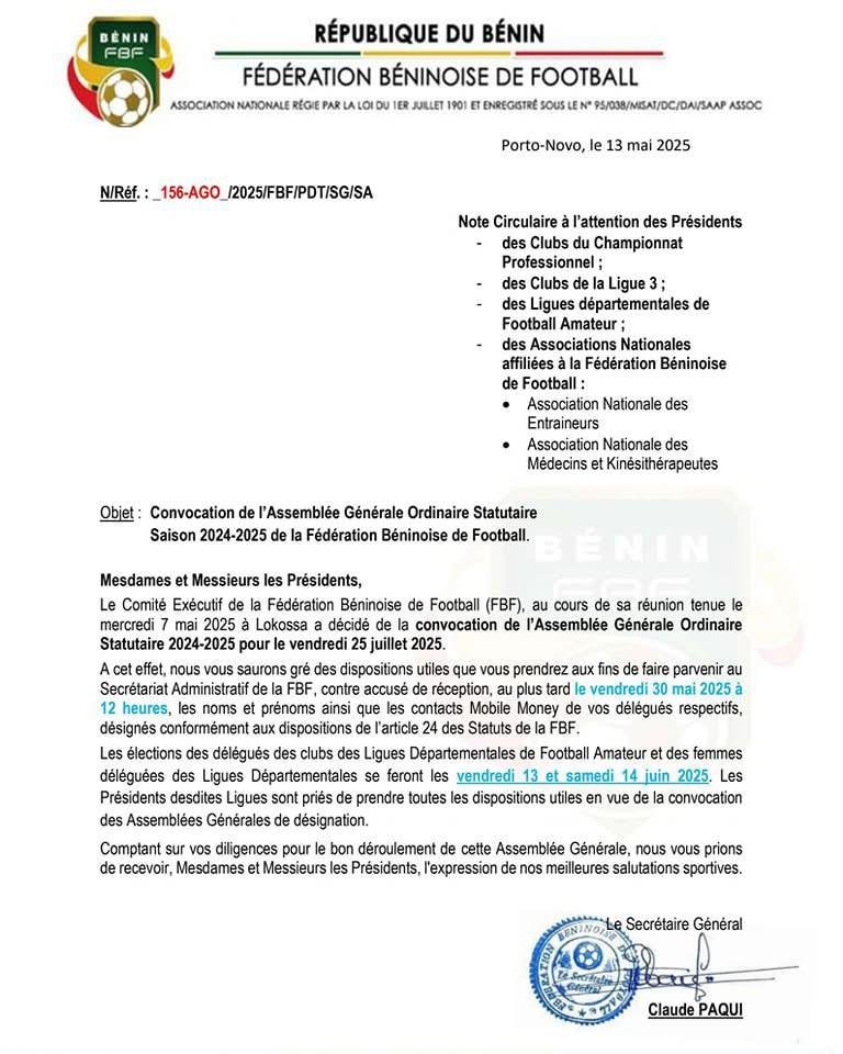 La Fédération Béninoise de Football (FBF) tiendra son Assemblée Générale Ordinaire au titre de l’exercice 2024-2025 le vendredi 25 juillet 2025 à Lokossa. L’annonce a été faite à travers une note officielle émise par l’instance dirigeante du football béninois.