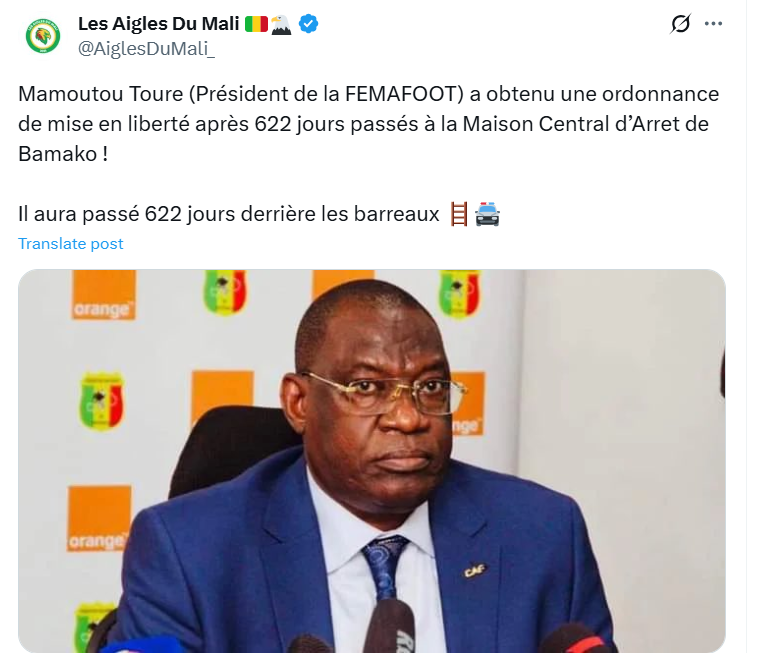 Mamoutou Touré, président de la Fédération malienne de football (Femafoot), a été libéré de prison ce mardi 22 avril 2025 après 622 jours d’incarcération. La presse malienne rapporte que la justice a délivré une ordonnance de mise en liberté provisoire en sa faveur.