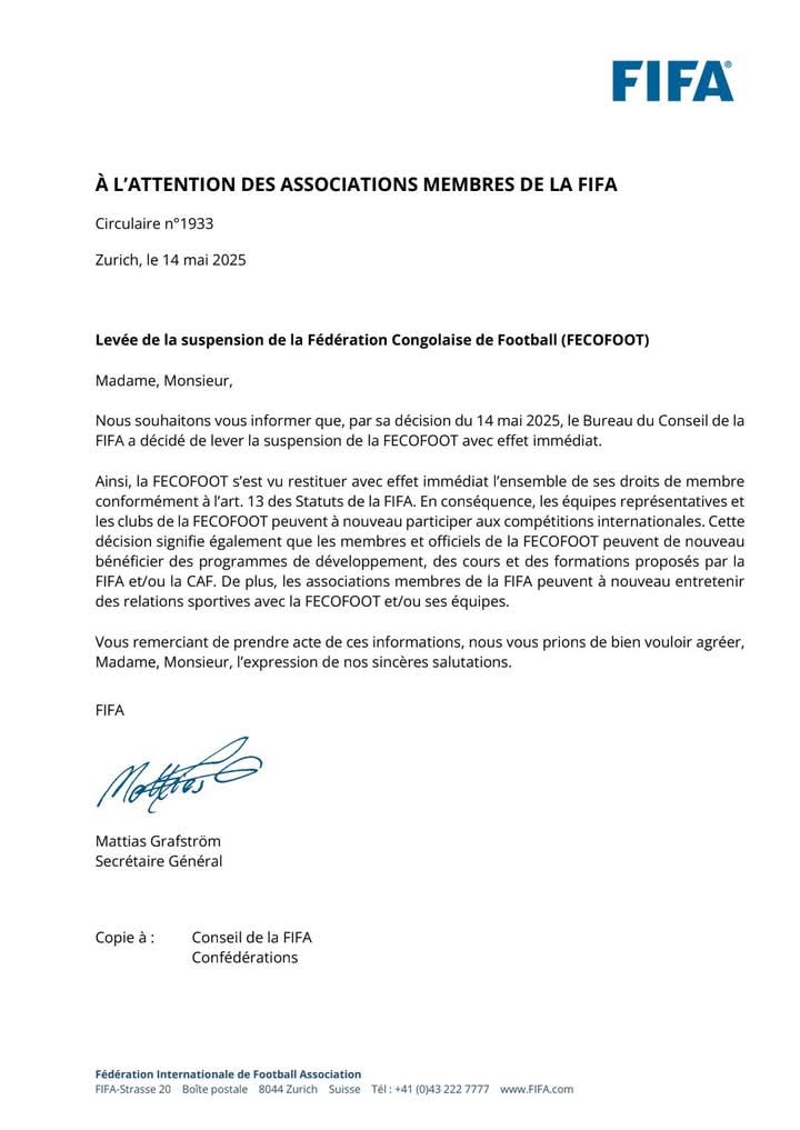 C’est officiel. Après plusieurs mois de mise à l’écart, la Fédération Congolaise de Football (FECOFOOT) retrouve sa place au sein de la communauté du football international. Suspendue provisoirement depuis le 6 février 2025 en raison d’une ingérence politique dans sa gestion, la FECOFOOT voit sa suspension levée par le Conseil de la FIFA, comme annoncé ce mercredi 14 mai 2025.