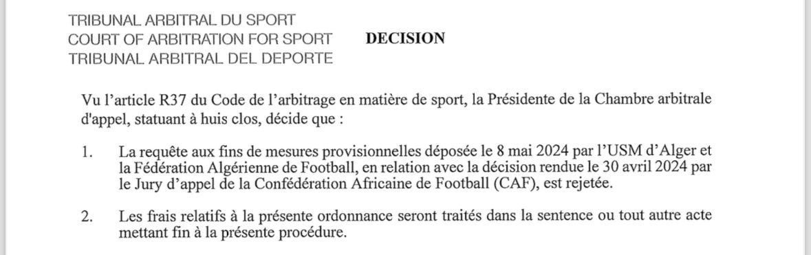 1. La requête aux fins de mesures provisionnelles déposée le 8 mai 2024 par l’USM d’Alger et la Fédération Algérienne de Football, en relation avec la décision rendue le 30 avril 2024 par le Jury d’appel de la Confédération Africaine de Football (CAF), est rejetée.