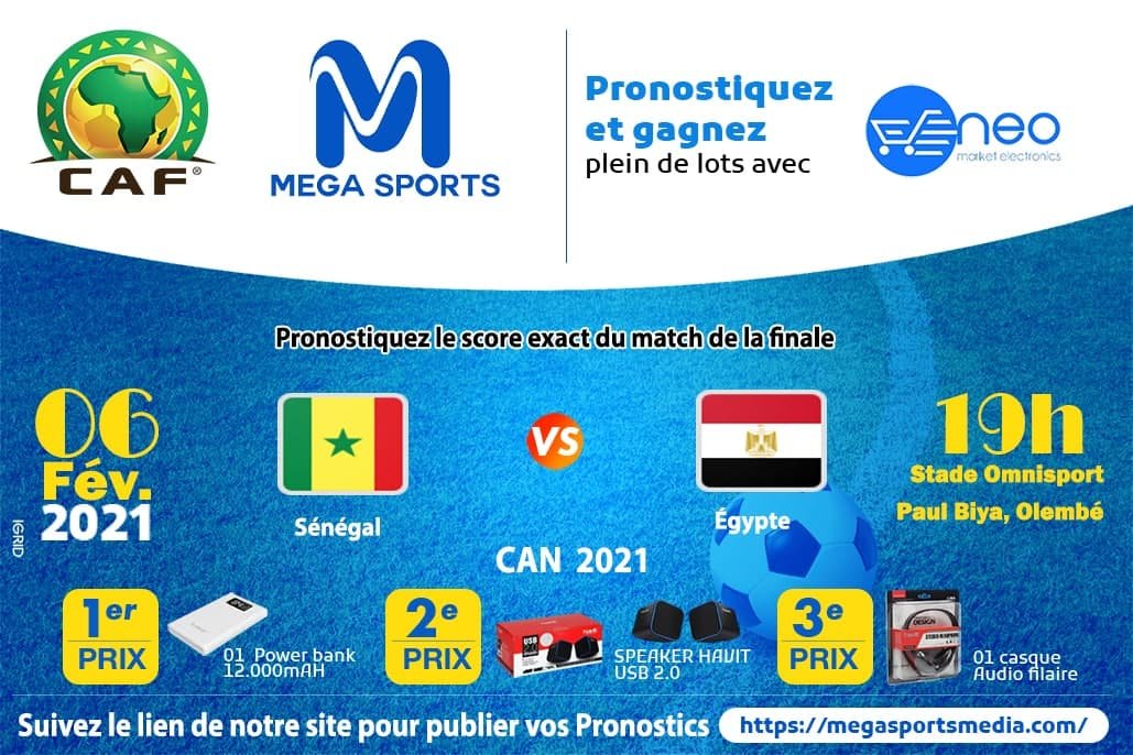 Sénégal vs Égypte, c’est la rencontre finale de la Can 2021. A cet effet, le média de production et de diffusion de l’actualité sportive en ligne, Méga Sports et son partenaire officiel NéO Market Electronics se veulent plus proche de vous. En effet, le duo organise un grand jeu pronostic. Ce jeu de prédiction aura lieu sur le site de Méga Sports. Il est ouvert à tout le monde, quelle que soit donc votre position géographique. Ainsi, plein de lots vous attendent.
