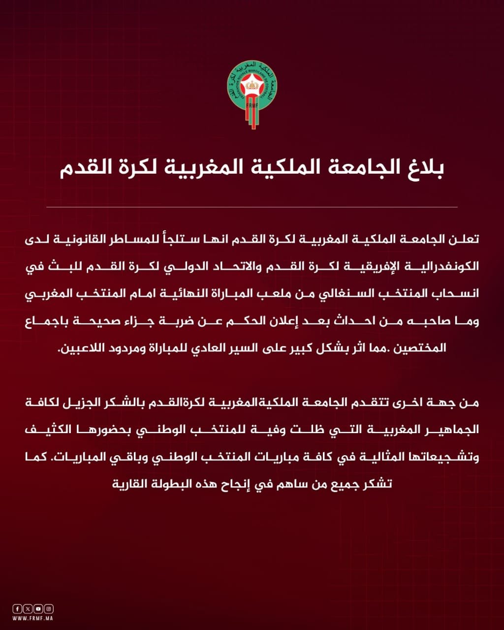 La Fédération Royale Marocaine de Football annonce qu’elle engagera une action en justice auprès de la Confédération Africaine de Football (CAF) et de la FIFA concernant le retrait de l’équipe nationale sénégalaise de la finale contre le Maroc et les événements qui ont suivi la décision de l’arbitre d’accorder un penalty, décision jugée correcte par tous les experts. Ce retrait a fortement perturbé le déroulement du match et affecté la performance des joueurs.