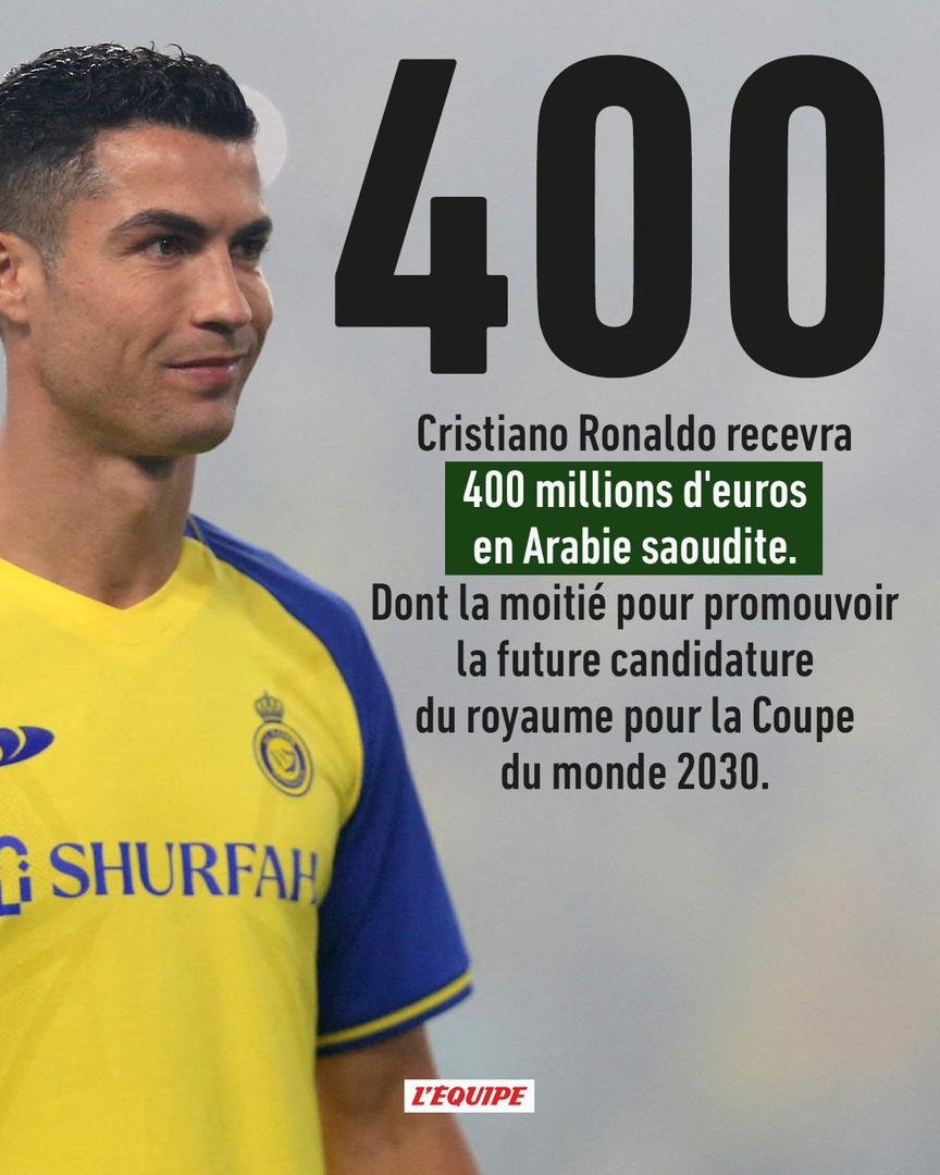 Selon l’ Agence France presse, Une source proche d’Al-Nassr, a révélé que Cristiano Ronaldo, recevra 400 millions d’euros en Arabie saoudite.La moitié de la somme lui permettra en effet de promouvoir la future candidature du royaume saoudien pour la Coupe du monde en 2030.