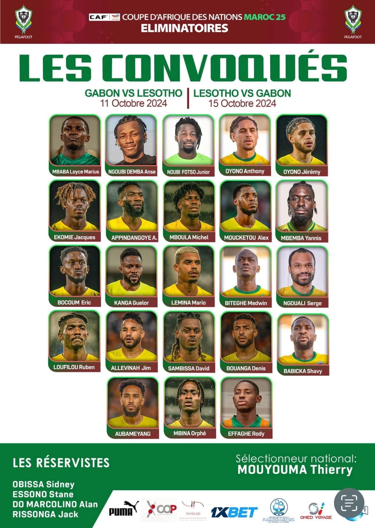 La Fédération gabonaise de football a officiellement annoncé ce vendredi 4 octobre 2024 la liste des joueurs convoqués pour les rencontres des 3ème et 4ème journées des éliminatoires de la CAN 2025. Le Gabon joue deux fois contre le Lesotho, les 11 et 15 octobre 2024. Cette sélection ne réserve pas de grandes surprises, avec la présence des cadres habituels tels que Pierre-Emerick Aubameyang et Mario Lemina, véritables piliers de l’équipe nationale.