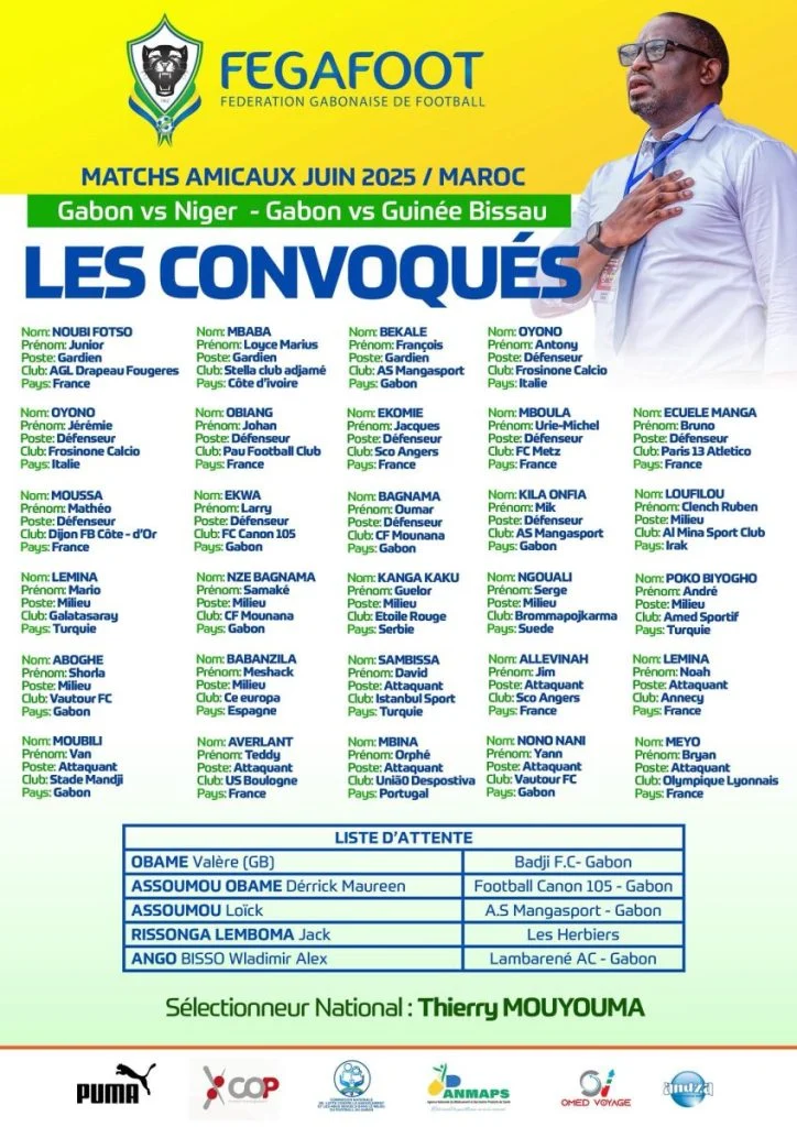 En vue des rencontres amicales prévues les 6 et 9 juin 2025 à Casablanca face au Niger et à la Guinée-Bissau, le sélectionneur du Gabon, Thierry Mouyouma, a révélé une liste élargie de 29 joueurs. Cette convocation marque un tournant stratégique, avec de nombreux cadres laissés au repos et plusieurs nouveaux visages qui tenteront de s’imposer chez les Panthères.