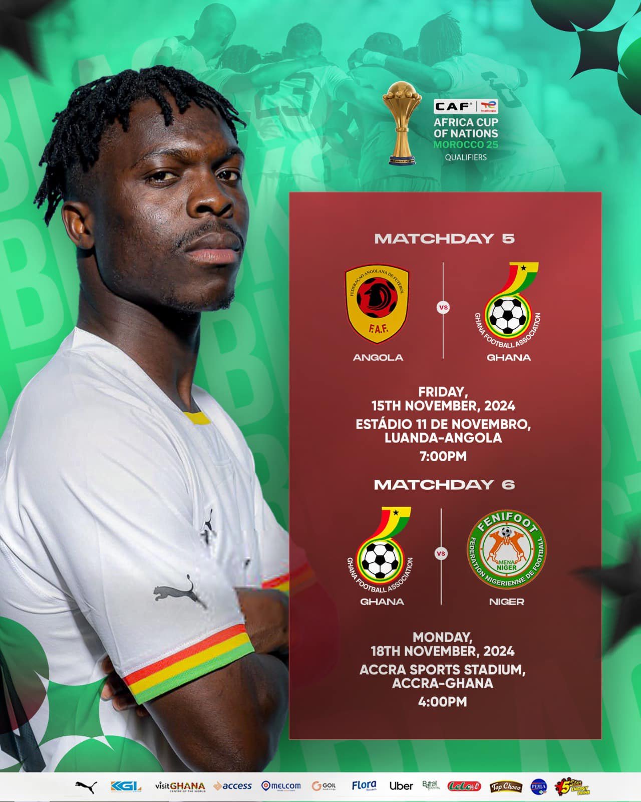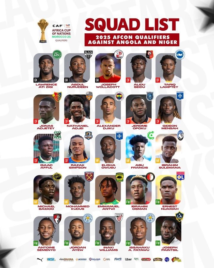 Le sélectionneur ghanéen, Otto Addo, a dévoilé la liste des joueurs retenus pour les matchs des 5ᵉ et 6ᵉ journées des qualifications pour la CAN 2025. Le Ghana affrontera l’Angola à l’Estadio 11 de Novembro de Luanda le vendredi 15 novembre 2024. Les Black stars affronteront ensuite le Niger au stade sportif d’Accra le lundi 18 novembre 2024. Une liste sans surprise avec deux nouvelles têtes : Emmanuel Antwi et Razak Simpson.