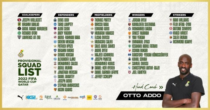 Ce vendredi 4 novembre 2022, le sélectionneur du Ghana, Otto Addo, a dévoilé une liste élargie de 55 joueurs retenus pour le mondial 2022. La compétition prévue pour débuter le 20 novembre 2022 au Qatar, verra les Black Stars avec probablement tous les cadres de la sélection, les binationaux et aussi les jeunes, qui sont déjà présents dans cette liste.