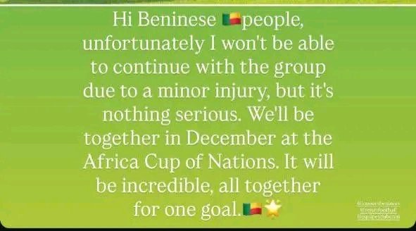 Après l’annonce officielle, le joueur s’est prononcé sur son forfait. Sur Instagram, le joueur a indiqué : « Salut peuple béninois, Malheureusement je ne pourrai pas continuer avec le groupe en raison d’une petite blessure, mais rien de sérieux. Nous serons ensemble en décembre pour la Coupe d’Afrique des Nations. Ce sera incroyable, tous ensemble pour un seul objectif. »
