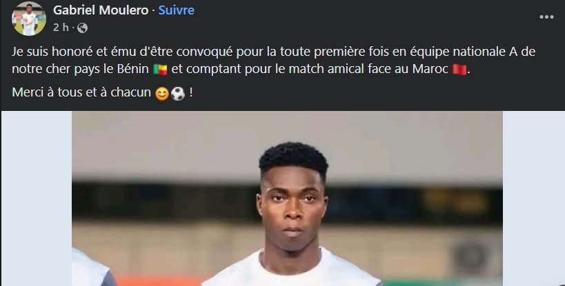 « Je suis honoré et ému d’être convoqué pour la toute première fois en équipe nationale A de notre cher pays le Bénin et comptant pour le match amical face au Maroc. Merci à tous et à chacun ![]()