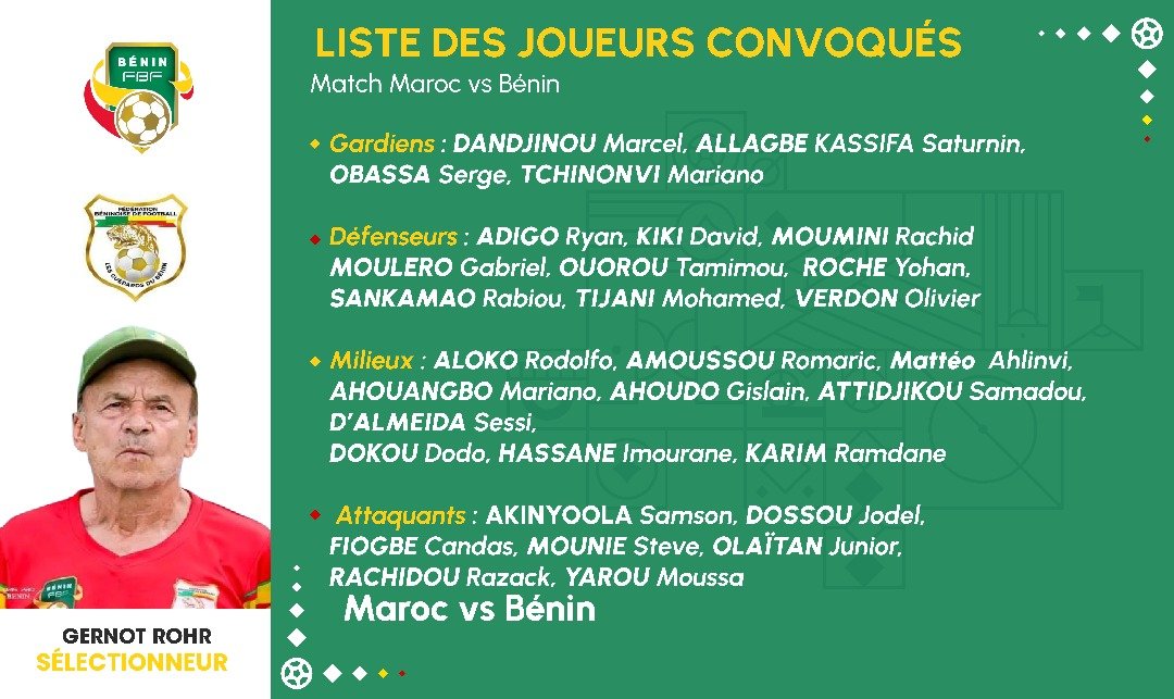 La liste de Gernot Rohr est marquée par le retour du défenseur Olivier Verdon. Le technicien a confié sur le sujet : « Olivier Verdon a reconnu ses erreurs, il s’est excusé. Il est performant dans son club. » Samson AKINYOOLA aussi est de retour après une belle saison et les problèmes administratifs définitivement résolus avec l’approbation de la FIFA obtenue. Quelques absences sont à noter. Andréas Hountondji, Cédric Hountondji et Tosin Aiyegun sont absents pour cause de blessures.