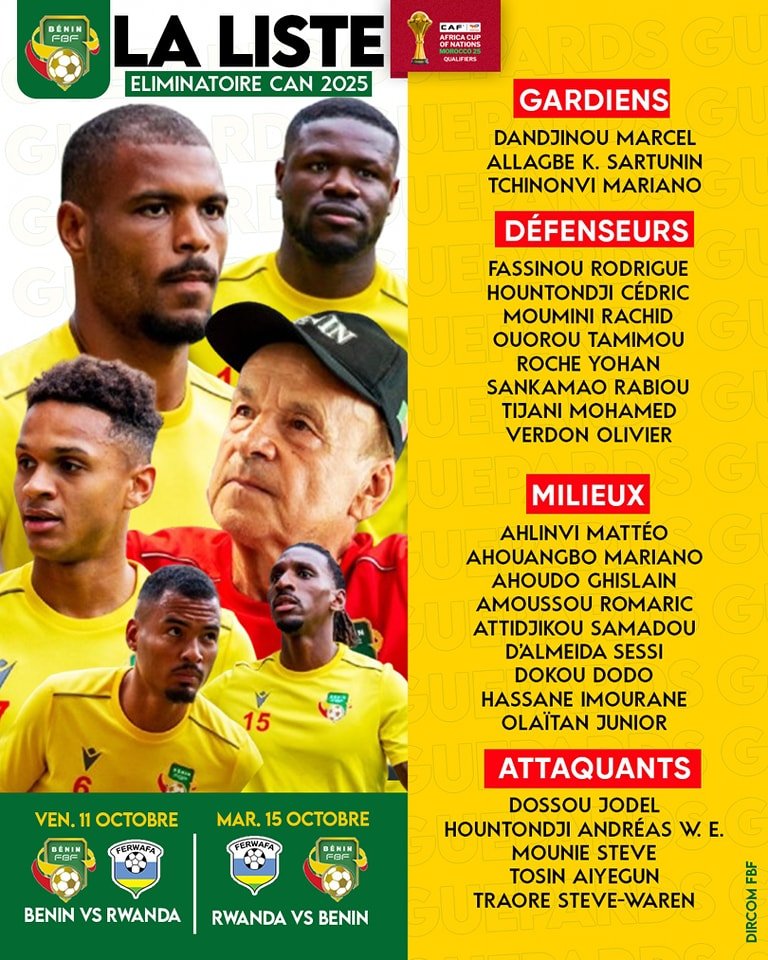 Lancées en septembre 2024 avec les deux premières journées, les éliminatoires de la CAN 2025 reviennent en octobre 2024. A l’image la plupart des sélections africaines, les Guépards du Bénin affronte une même équipe deux fois. Ce samedi 05 octobre 2024, la liste des joueurs convoqués par le sélectionneur national du Bénin, Gernot Rohr, a été dévoilée. Le Bénin affrontera le Rwanda deux fois lors des 3ᵉ et 4ᵉ journées des qualifications. Découvrez les joueurs convoqués pour ces deux rendez-vous.