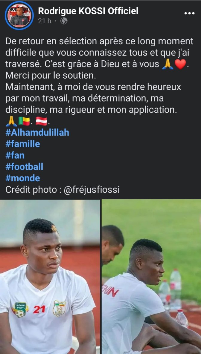 Après une longue absence marquée par des défis personnels, Rodrigue Kossi a effectué son retour en sélection nationale du Bénin à l’occasion de la trêve de juin 2023. Un retour qu’il apprécie et ne le cache pas. Dans une émotionnelle publication, Rodrigue Kossi a exprimé sa gratitude envers Dieu et envers ses supporters qui l’ont soutenu tout au long de sa période difficile.