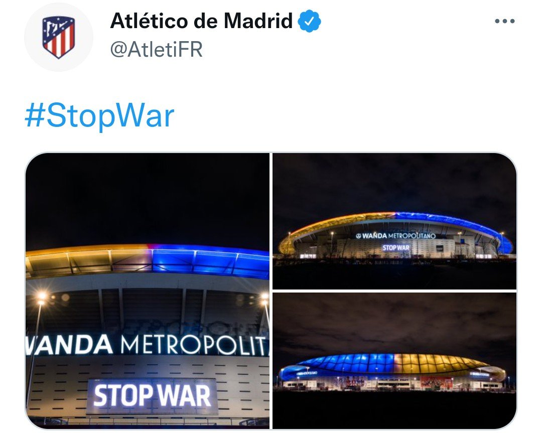 Depuis l’invasion de l’Ukraine par la Russie, le monde du football se mobilise pour apporter leur soutien afin que la paix revienne. Pour apporter son soutien à l’Ukraine et à la paix, l’Atlético de Madrid a éclairé son stade, le Wanda Metropolitano, en jaune et bleu, les couleurs du drapeau ukrainien. Et au-dessus de l’entrée du stade, le message « Stop War » (Stoppez la guerre) a été écrit. Les images ont été publié sur le compte Twitter du club.