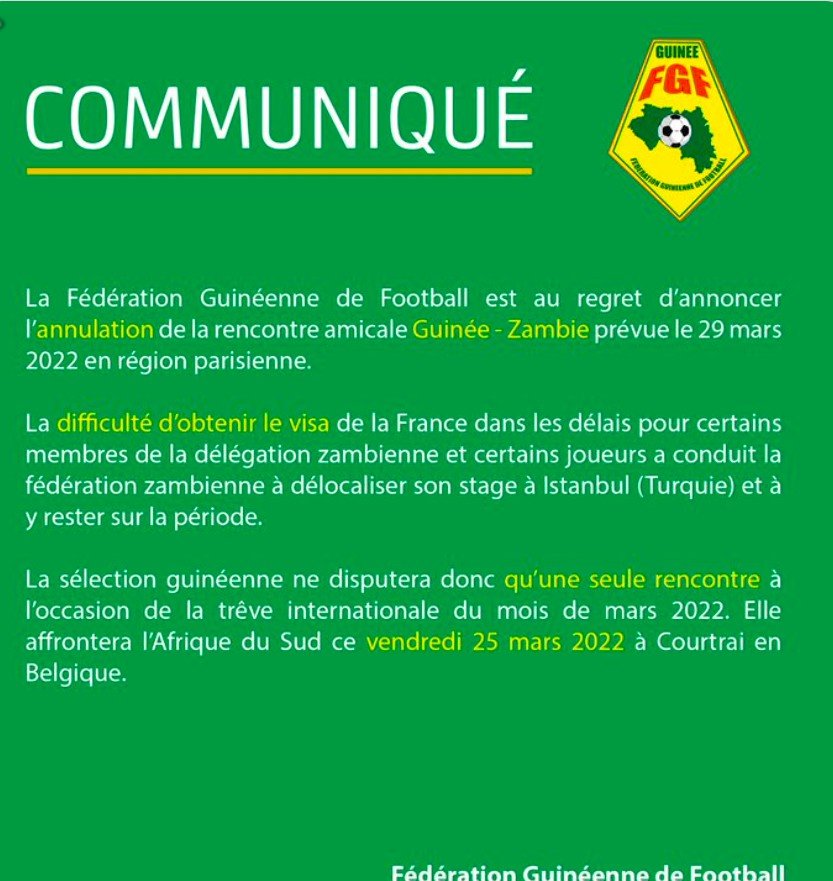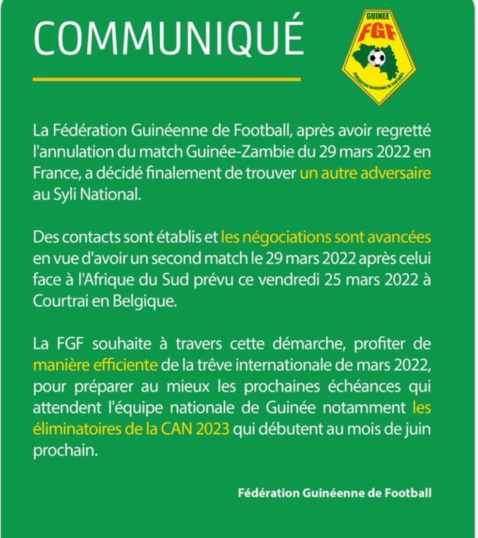 La Guinée a prévu deux matchs amicaux lors des journées FIFA Mars 2022, contre l’Afrique du Sud et la Zambie. Ainsi, après l’Afrique du Sud vendredi 25 mars 2022, à Courtrai en Belgique, le Syli National était censé jouer contre la Zambie mardi 29 mars 2022 en région parisienne, toujours en match amical. Cependant ce match contre la Zambie n’aura plus lieu.