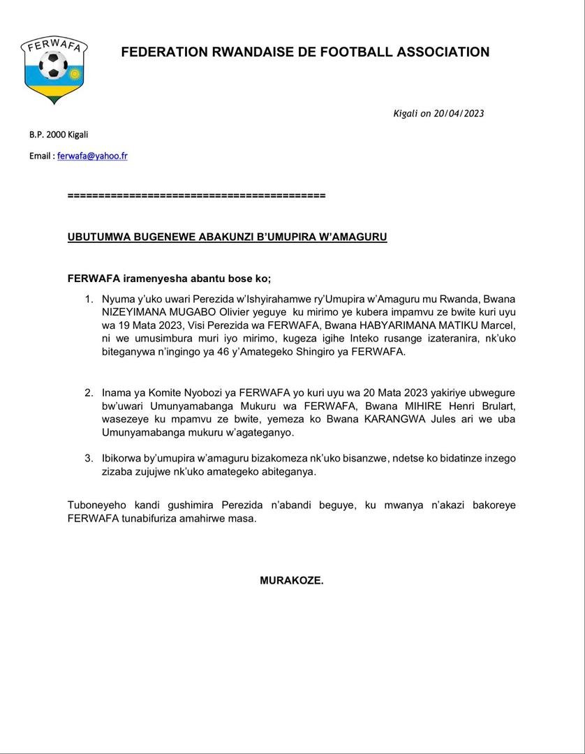 2. La réunion du Comité Exécutif de la FERWAFA du 20 avril 2023 a reçu de l’ancien Secrétaire Général de la FERWAFA, Monsieur MIHIRE Henri Brulart, qui a démissionné pour des raisons personnelles, a confirmé que M. KARANGWA Jules est celui qui vit secrétaire général par intérim.