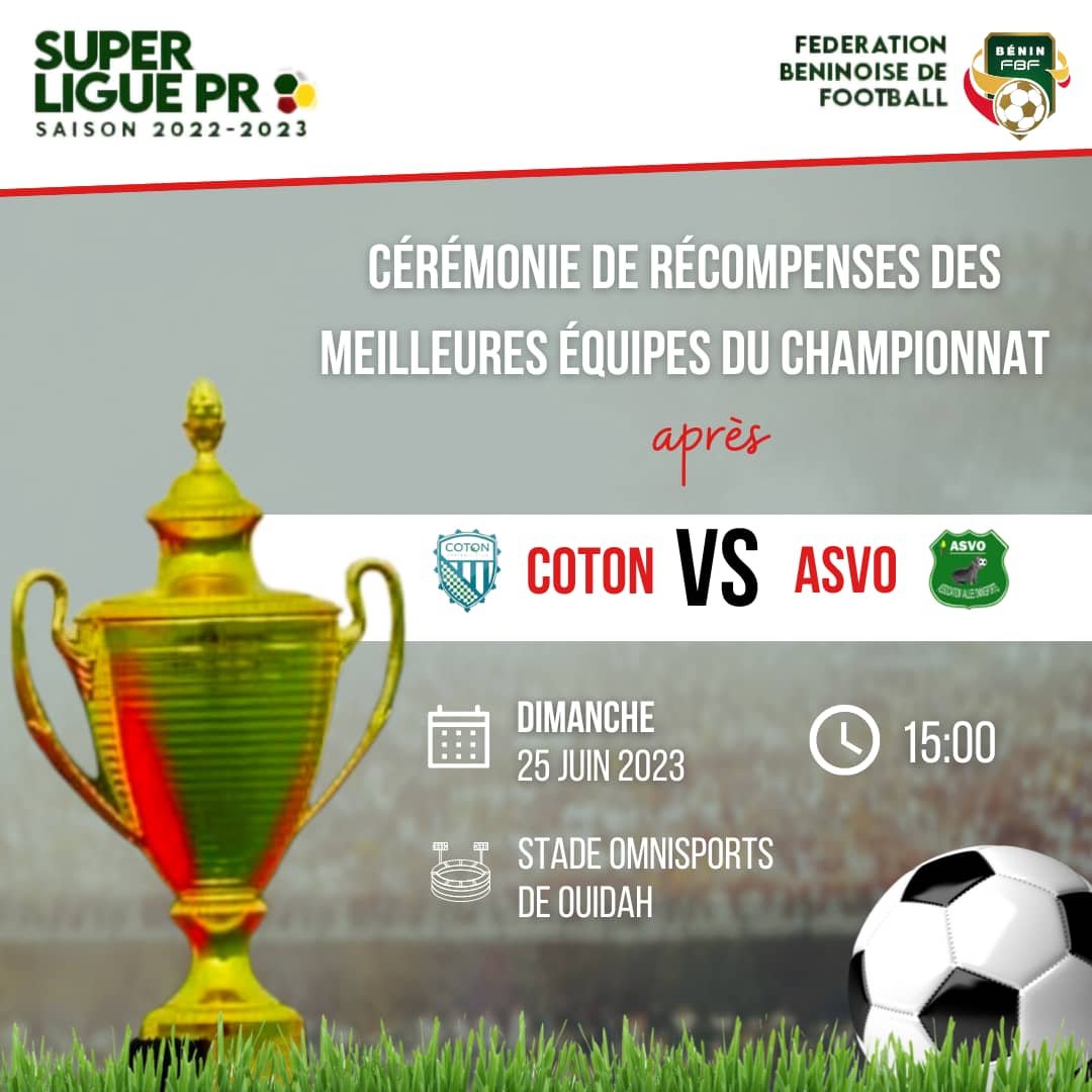 La Fédération Béninoise de Football (FBF) se prépare à organiser une cérémonie de remise de trophées pour honorer les champions et les acteurs les plus méritants de la saison 2022-2023. Cet événement prestigieux aura lieu le dimanche 25 juin 2023, au stade omnisports de Ouidah, à l’issue du match opposant Coton Sport à l’ASVO, lors de la dernière journée de la Super Ligue Pro 2023.