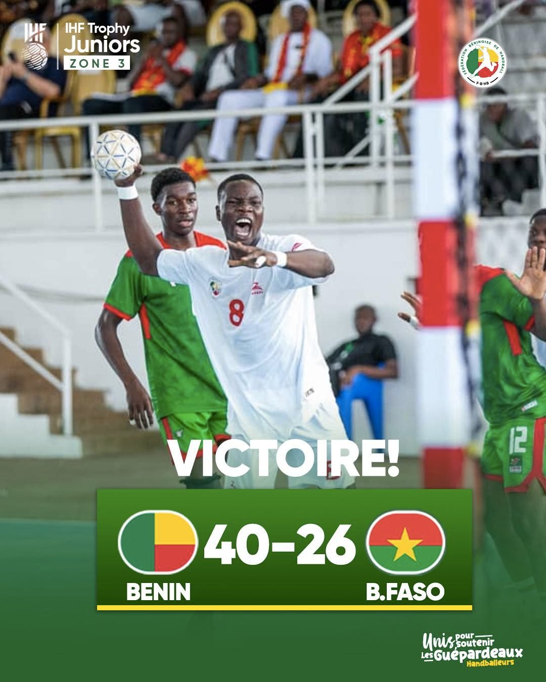 Les Guépards U20 du Bénin se sont brillamment qualifiés pour la finale de l’IHF Trophy masculin 2026 à Lomé, après une demi-finale parfaitement maîtrisée ce vendredi 10 avril 2025. Opposés au Burkina Faso, les jeunes Béninois n’ont laissé aucune chance à leur adversaire, s’imposant largement sur le score de 40 à 26. Une performance solide qui témoigne de la supériorité du collectif béninois tout au long de la rencontre. Grâce à cette victoire éclatante, le Bénin valide son ticket pour la finale et se rapproche un peu plus du sacre. Les Guépards affronteront le vainqueur de l’autre demi-finale entre le Nigeria et le Ghana.