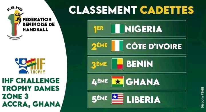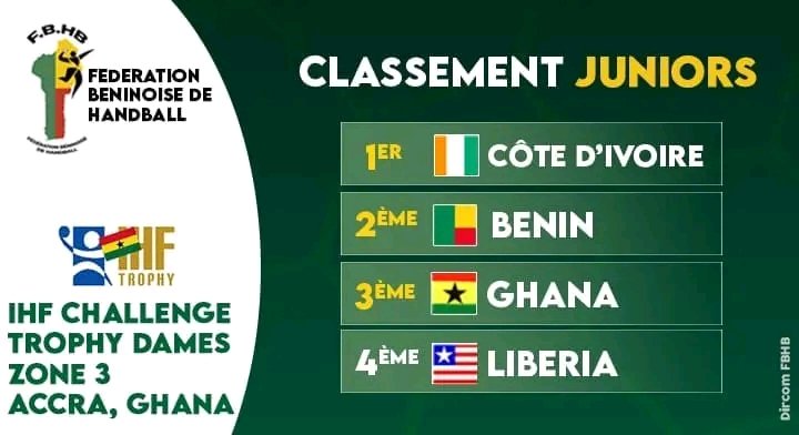 Débuté le 11 avril 2023, l’IHF Trophy Dames Zone 3, Accra 2023 a pris fin le dimanche 16 avril 2023. Le Bénin était representé dans les deux catégories de la compétition, cadette et junior. Au terme du tournoi, le Bénin a terminé à la 2ème place chez les juniors et à la 3ème place chez les cadette. Les jeunes béninoises ont décroché la médaille d’argent chez les juniors et la médaille de bronze chez les cadette.