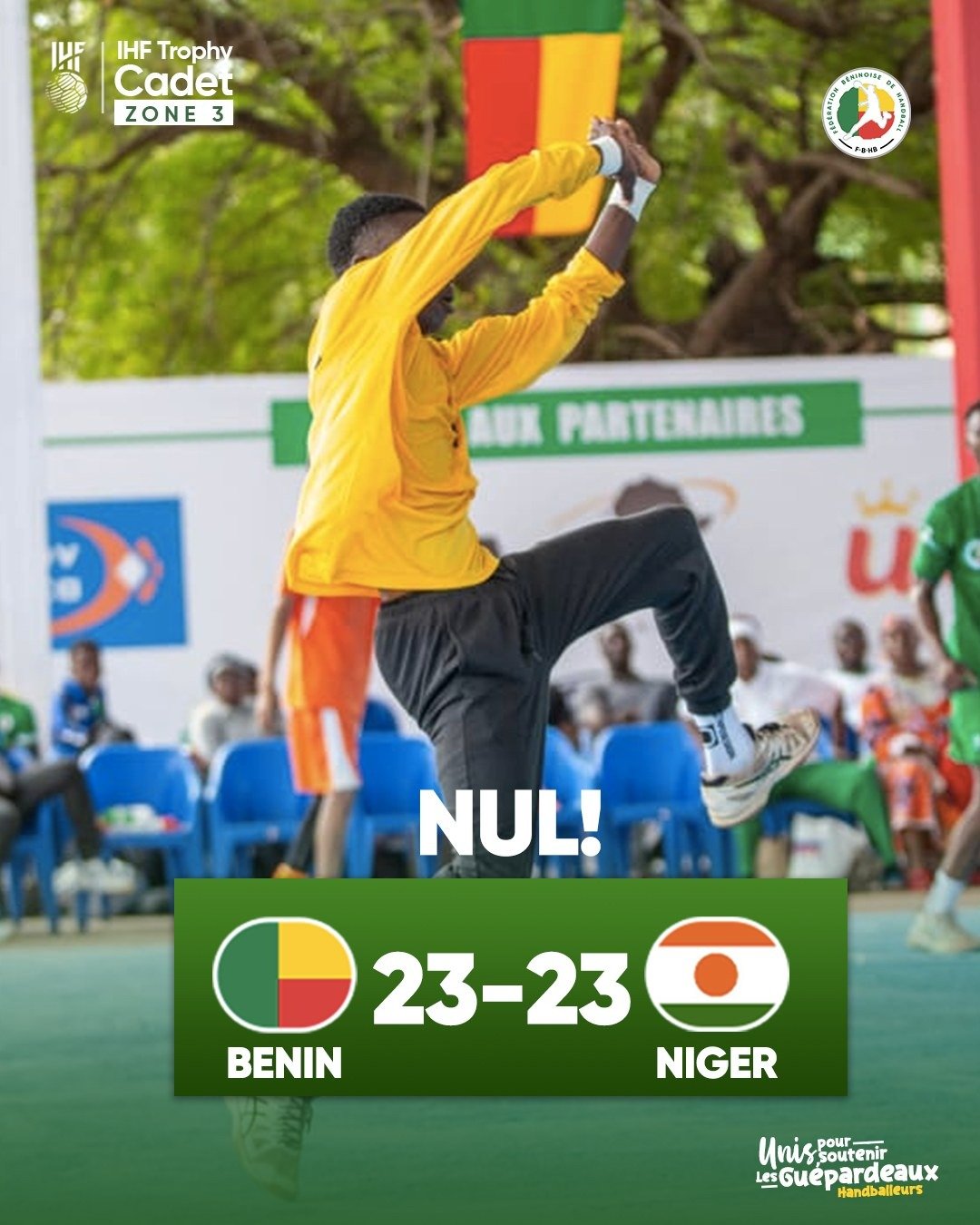 Dans une rencontre disputée, les U18 béninois ont livré une prestation solide face au Niger. Score final : 23-23 (13-11 à la mi-temps). Après avoir mené au score, les jeunes Guépards ont été rejoints en fin de match, concédant un nul qui reflète l’intensité de la rencontre. Un point précieux, mais qui laisse des regrets au vu du scénario.
