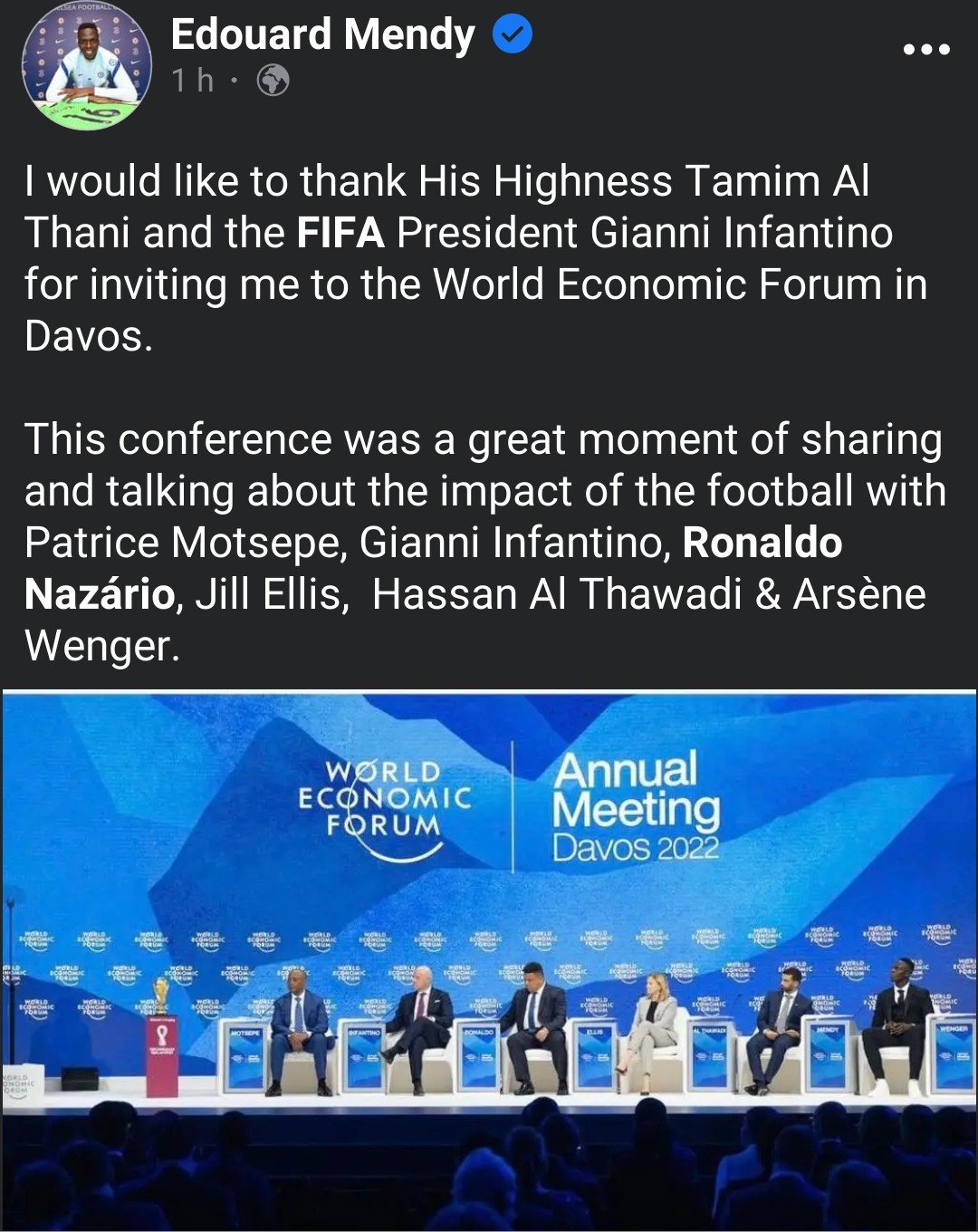 Ce lundi 23 mai 2022, le Forum Économique de Davos s’est déroulé avec la présence de plusieurs personnalités du football. Le président de la CAF, Patrice Motsepe, le président de la FIFA, Gianni Infantino et bien d’autres. Ayant terminé la saison 2021-2022 avec son club de Chelsea, Édouard Mendy était aussi de la partie. Un moment que ce dernier a apprécié et ne l’a pas caché.