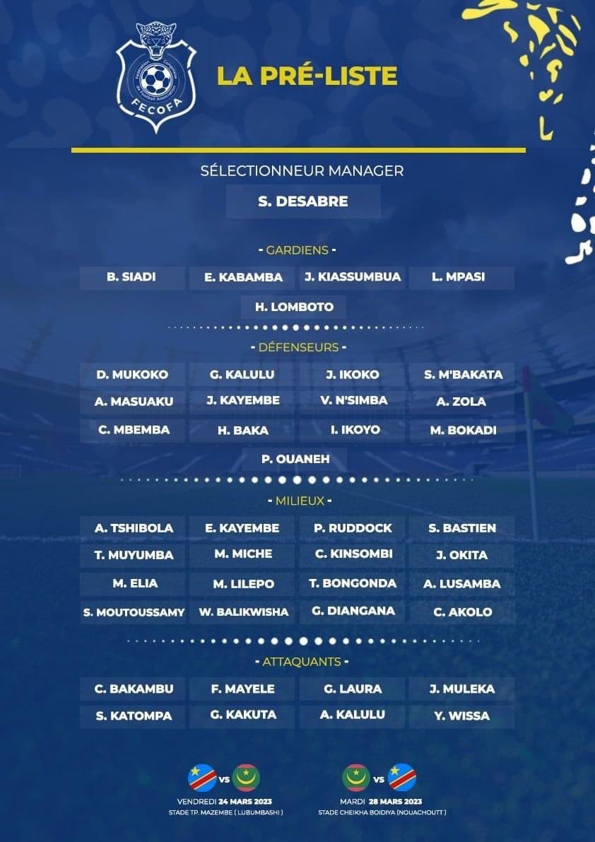 La RD Congo s’apprête à disputer une double confrontation décisive face à la Mauritanie dans le mois de mars 2023. Deux rencontres qui comptent pour les 3ᵉ et 4ᵉ journée des éliminatoires de la CAN 2023. Pour ces deux sorties, le sélectionneur Desarbre a dévoilé une pré-liste des joueurs retenus. Une liste dans laquelle les cadres Zola, Baka, Lilepo, Bakambu et Muleka sont inclus.