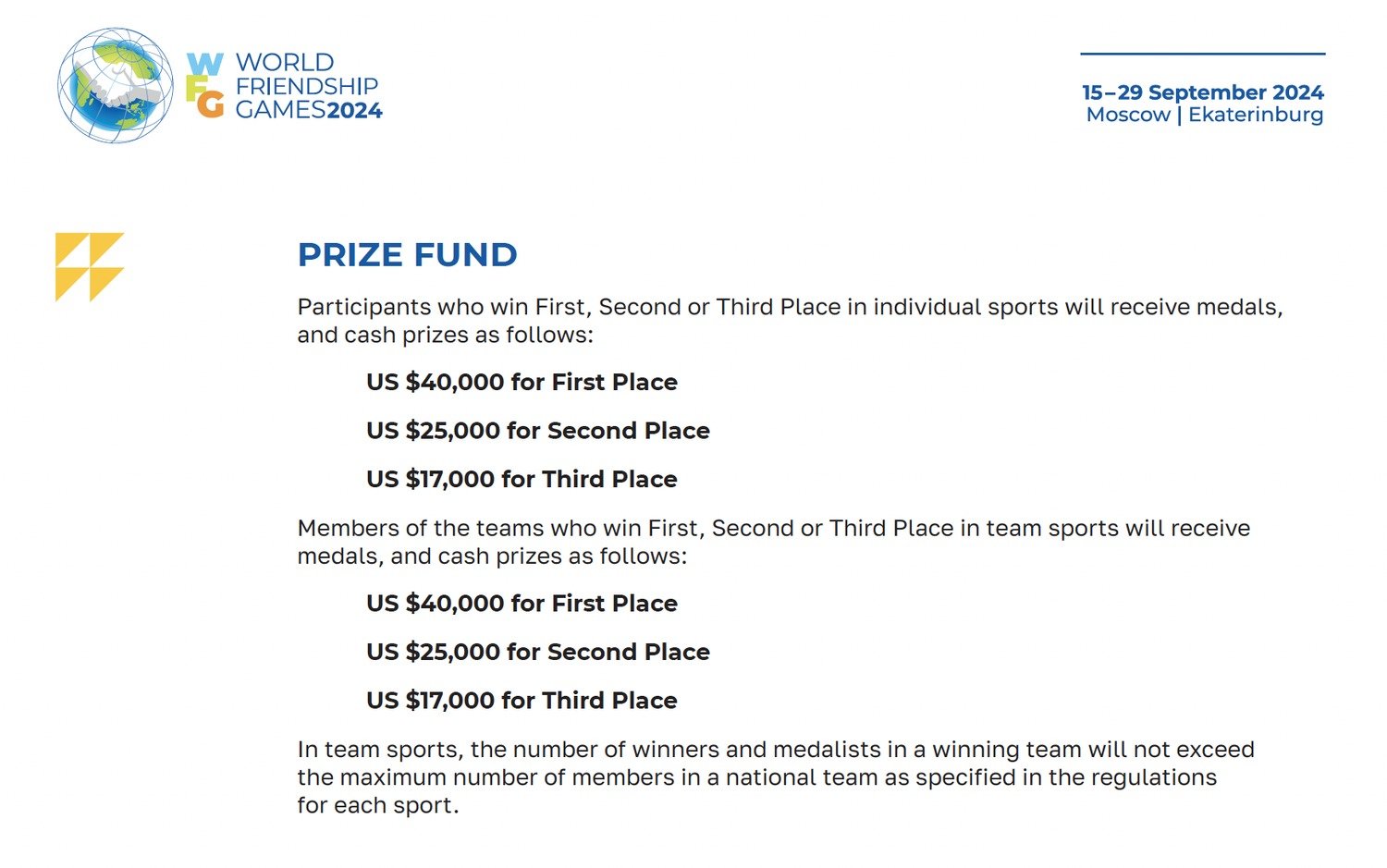 Dans les sports d’équipe, le nombre de gagnants et de médaillés dans une équipe gagnante ne dépassera pas le nombre maximum de membres d’une équipe nationale tel que spécifié dans la réglementation pour chaque sport.