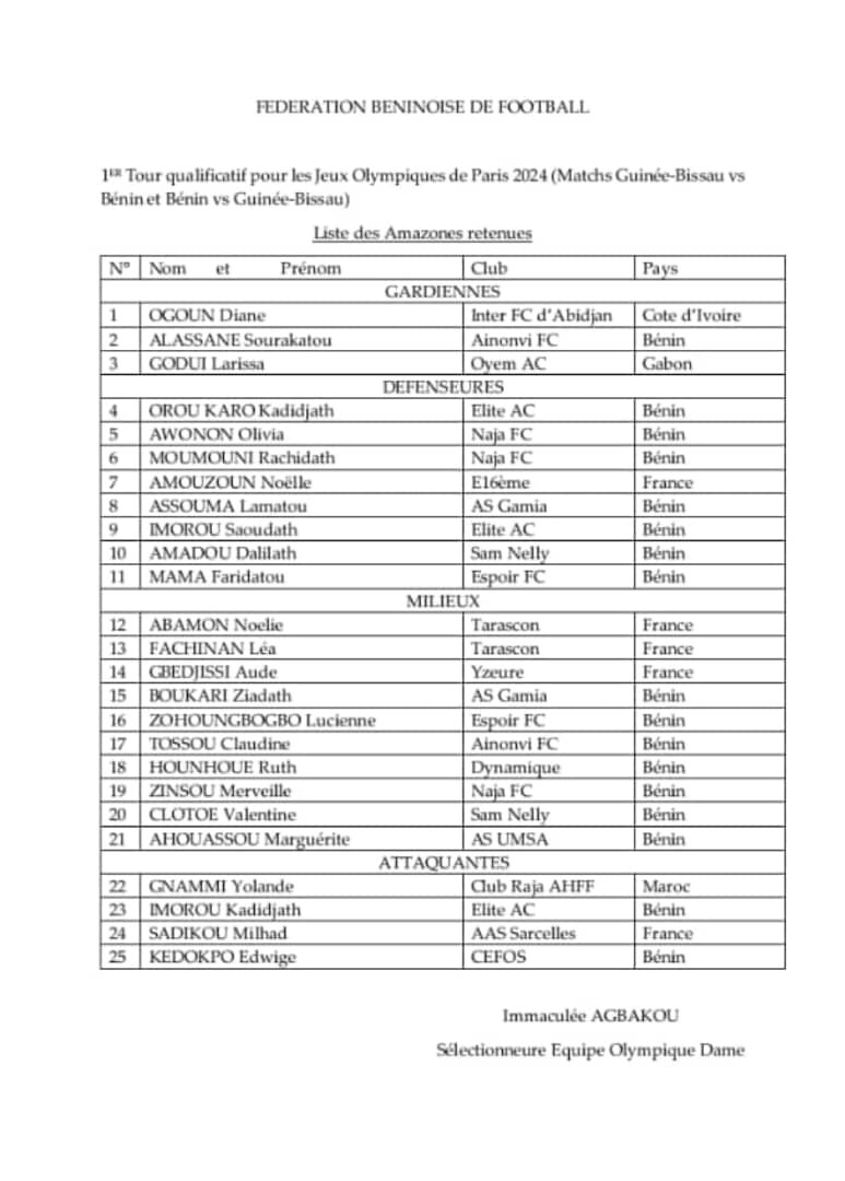 Dans la perspective des Éliminatoires qualificatifs au tournoi de football féminin pour les Jeux Olympiques de Paris 2024, la sélectionneuse Immaculée AGBAKOU a annoncé la liste des joueuses retenues pour représenter les Amazones Espoirs du Bénin lors du premier tour. L’équipe béninoise sera confrontée à la Guinée-Bissau 🇬🇼 lors de cette phase cruciale de qualification.
