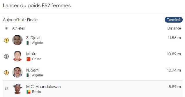 Voici les résultats de la finale du lancer du poids F57 femmes