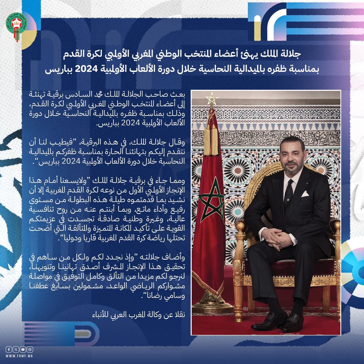 Dans son message, le roi Mohammed VI a exprimé une profonde reconnaissance pour cette réussite historique : « Nous ne pouvons, devant cet exploit olympique, le premier du genre pour le football marocain, que saluer votre belle prestation tout au long de ce prestigieux tournoi, l’esprit élevé de compétitivité dont vous avez fait montre ainsi que votre patriotisme sincère qui s’est manifesté à travers votre ferme détermination à confirmer la place privilégiée et de choix qu’occupe désormais le football marocain sur les plans continental et international », a déclaré le souverain.