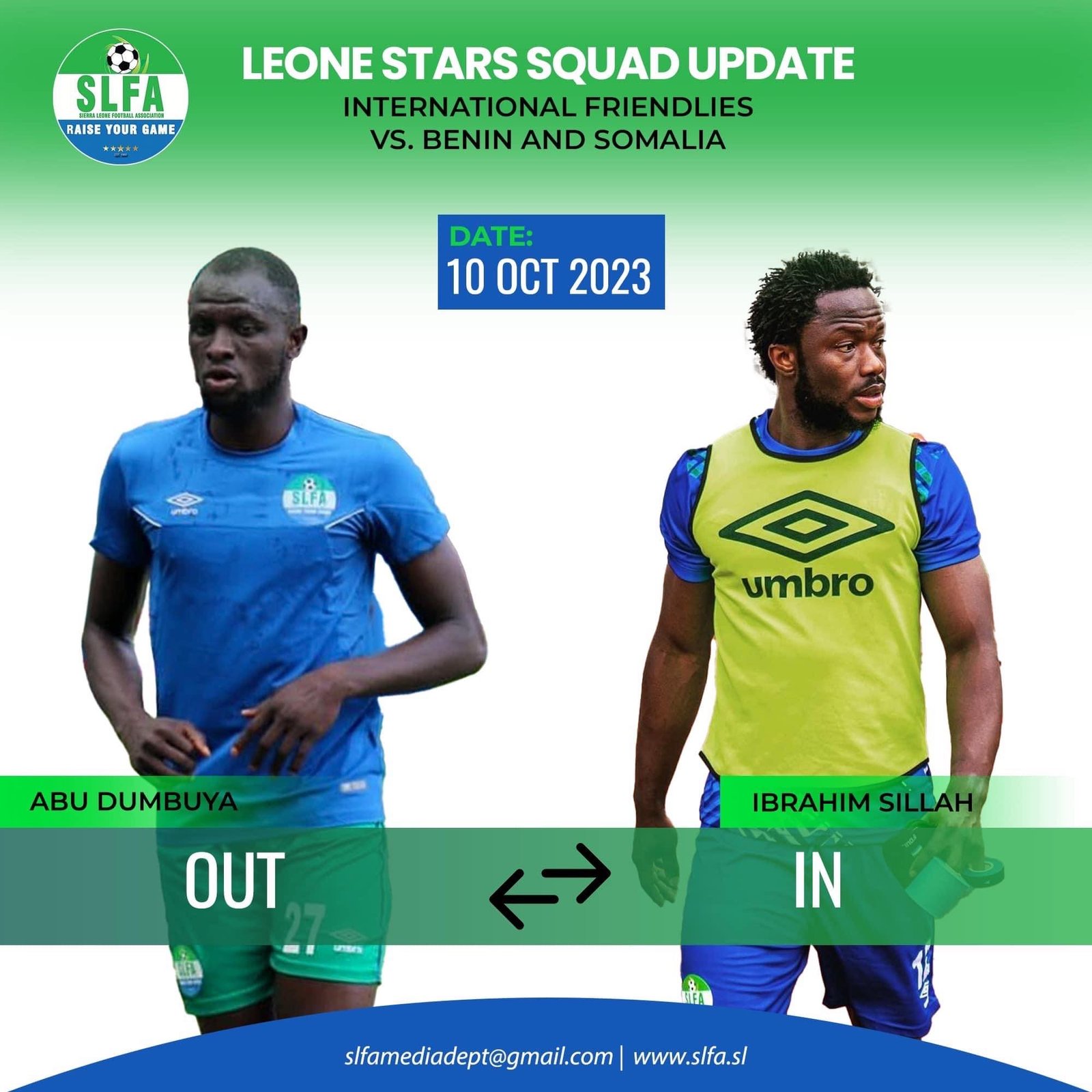 La Sierra Leone, comme de nombreuses autres équipes nationales africaines, se prépare pour une série de matchs amicaux en octobre 2023. Un changement de dernière minute a frappé l’équipe nationale de Sierra Leone en préparation pour son match contre le Bénin lors des journées FIFA d’octobre 2023. Le joueur Abu Dumbuya, qui faisait partie du groupe, a été contraint de déclarer forfait pour le rassemblement. Sa sortie de l’équipe a nécessité une solution rapide, et c’est Ibrahim Sillah qui a été appelé pour le remplacer.