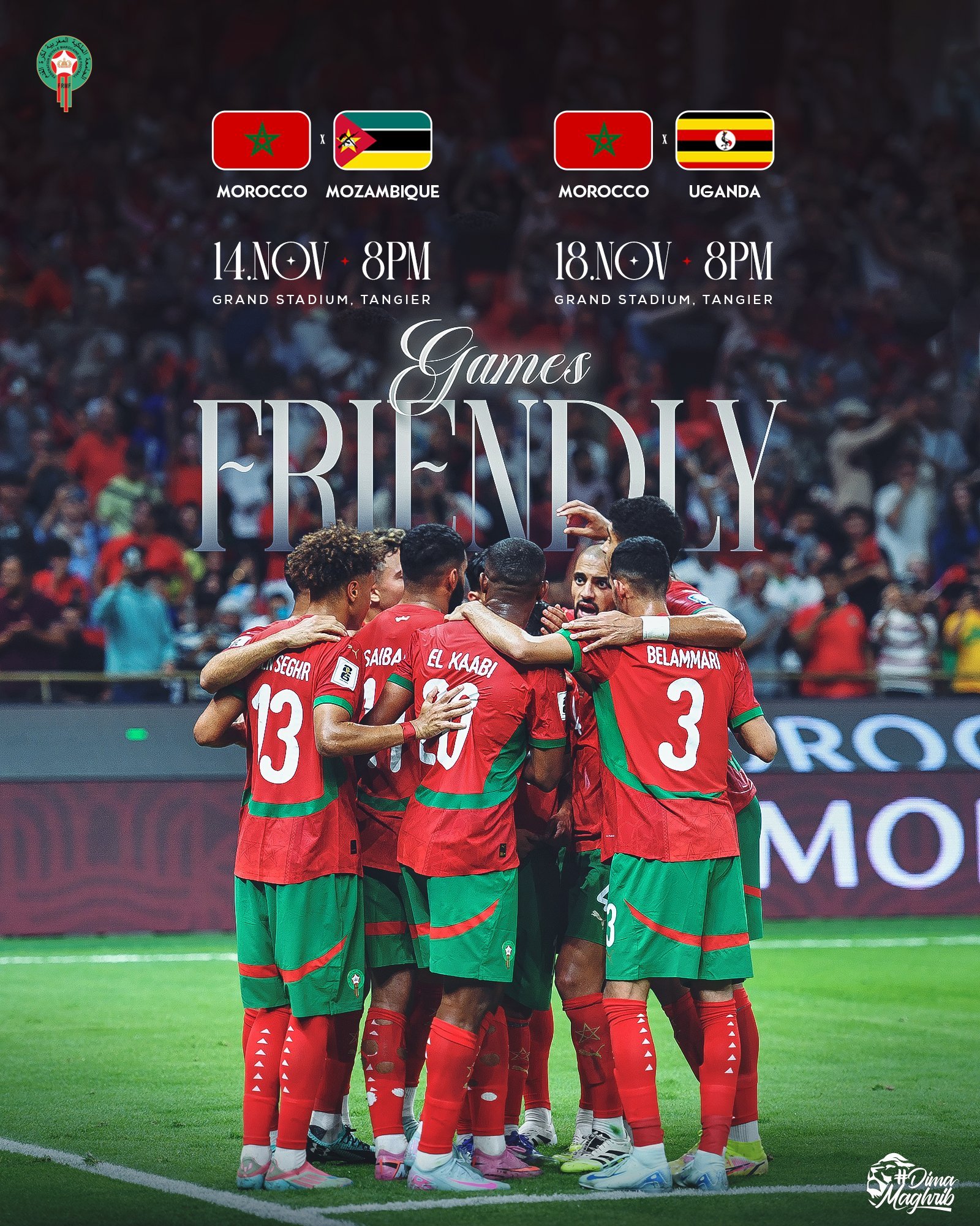 Ce jeudi 30 octobre 2025, la Fédération royale marocaine de football (FRMF) a officialisé le programme des matchs amicaux des Lions de l’Atlas pour la trêve internationale de novembre 2025. Ainsi, les Lions de l’Atlas disputeront deux matchs amicaux au Grand Stade de Tanger, respectivement face au Mozambique le 14 novembre puis, contre l’Ouganda le 18 novembre, soit quatre jours plus tard. Deux affiches qui s’inscrivent dans la continuité de la préparation marocaine à la CAN 2025, organisée à domicile du 21 décembre 2025 au 18 janvier 2026.