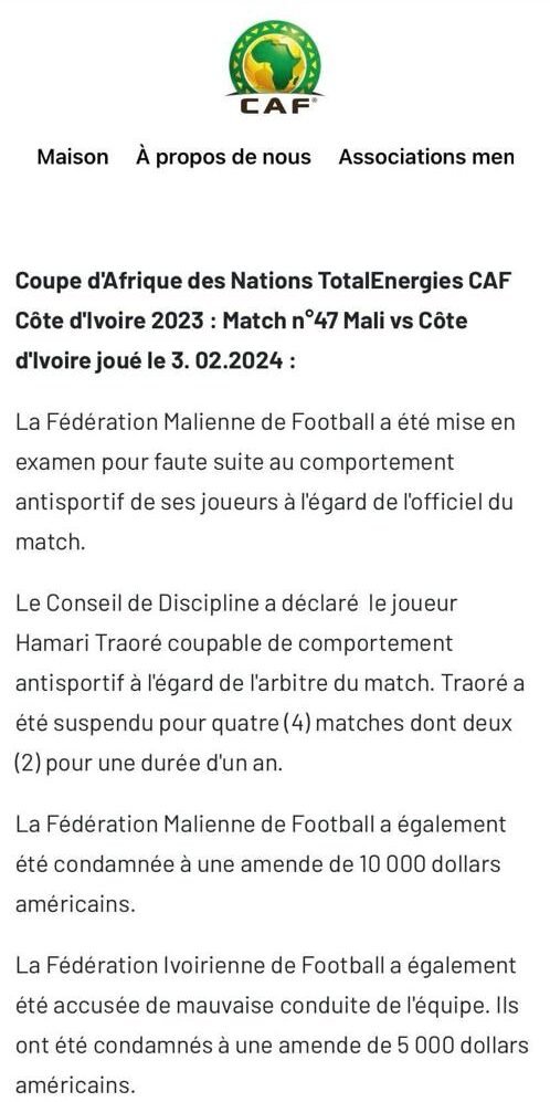 La CAF a pris des mesures disciplinaires à l’encontre du Mali et de la Côte d’Ivoire. Ceci, suite aux incidents survenus lors du quart de finale de la CAN 2023, opposant les deux équipes le 3 février 2024. Les deux sélections et le capitaine maliens, Hamari Traoré, ont été punis par l’instance.