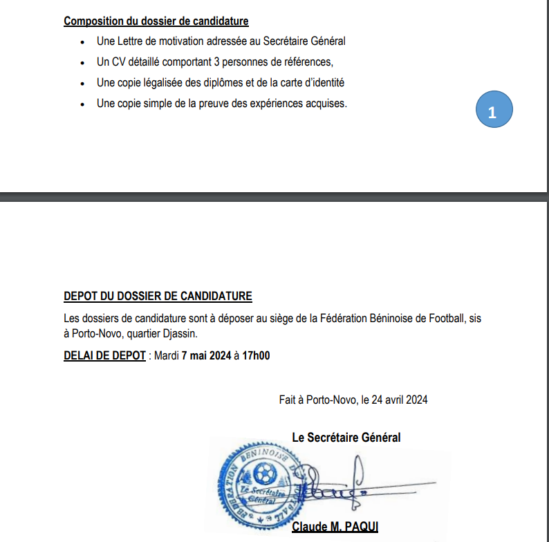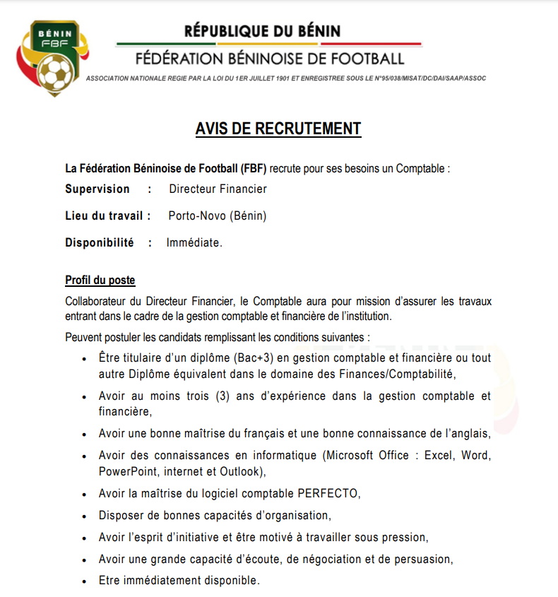 Au Bénin, l’instance dirigeante du football a lancé un appel à candidatures pour le poste de comptable. À travers un avis de recrutement ce mercredi 24 avril 2024, la fédération béninoise de football a révélé tous les détails à savoir.