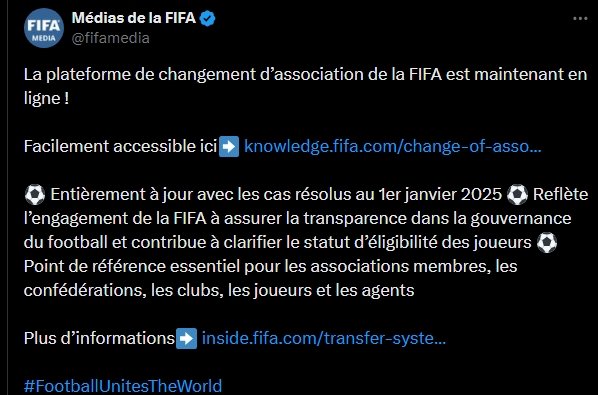 En effet, jusqu’ici, les changements d’associations internationales des joueurs binationaux étaient connus uniquement via les fédérations concernées ou les joueurs eux-mêmes. Désormais, cette nouvelle plateforme permettra au grand public d’accéder directement aux décisions officielles de la FIFA concernant ces changements.