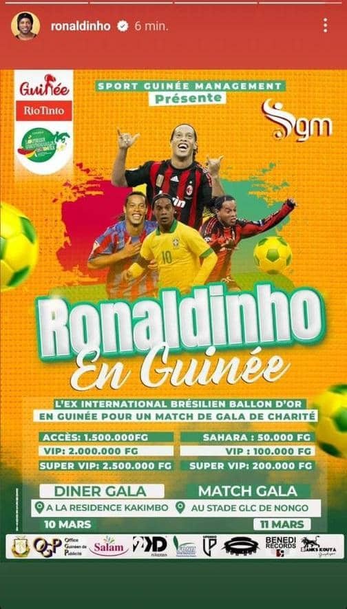 Ronaldo de Assis Moreira de son vrai non, l’homme de 43 ans a posé ses pieds pour la première fois sur le sol guinéen pour participer un gala de charité qui se déroulera au stade Général Lansana Conté de Nongo et un dîner de gala. Les deux évèneent ont été programmés pour les vendredi 10 et samedi 11 mars 2023.