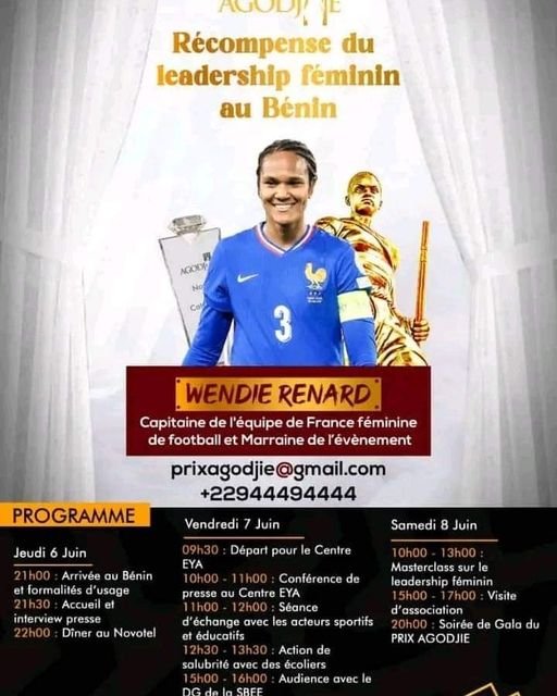 Connue pour sa carrière exemplaire et son rôle de leader au sein de l’équipe de France, Wendie Renard incarne les valeurs de détermination, de persévérance et d’excellence que le Prix AGODJIE souhaite promouvoir. Son arrivée à Cotonou marque un moment fort pour cette édition. Elle apporte une dimension internationale à l’événement.