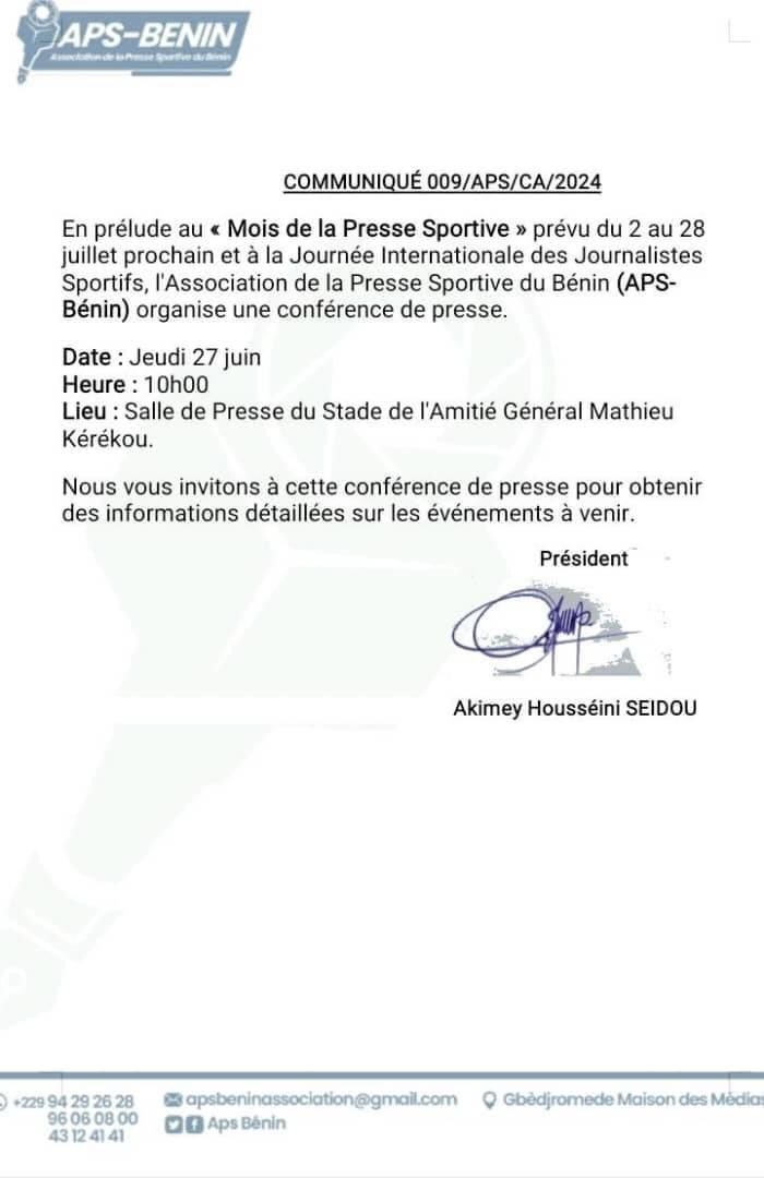 L’Association de la Presse Sportive du Bénin (APS-Bénin) convie les journalistes à une conférence de presse le jeudi 27 juin 2024, à 10h00, dans la Salle de Presse du Stade de l’Amitié Général Mathieu Kerekou. Cet événement précède le « Mois de la Presse Sportive » prévu du 2 au 28 juillet 2024 et la Journée Internationale des Journalistes Sportifs.
