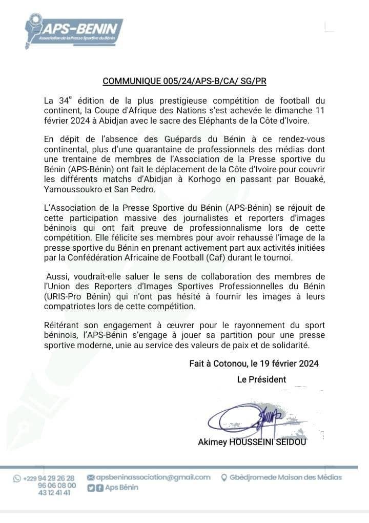 Selon le communiqué, plus de quarante professionnels des médias, dont une trentaine de membres de l’APS-Bénin, ont fait le déplacement en Côte d’Ivoire pour couvrir les différents matchs de la CAN 2023. Leur implication dynamique a grandement rehaussé la réputation du journalisme sportif béninois et a joué un rôle crucial dans la mise en avant du football africain.