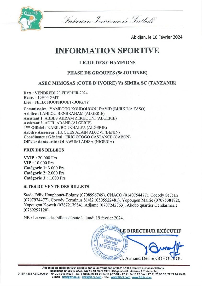 Dans le cadre de la cinquième journée pour la phase de groupe de la Ligue des champions CAF 2023-2024, le Béninois Hugues Alain Adjovi sera sur match opposant le ASEC Mimosas à SIMBA SC. Le président de la Commission des arbitres de la Caf a été désigné comme Arbitre Assesseur. Cette rencontre se tiendra le vendredi 23 février 2024 2023 au Stade Félix Houphouet-Boigny.