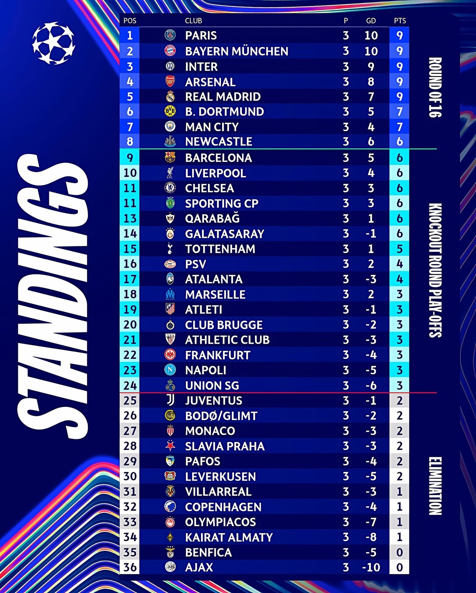 LDC UEFA 2025-2026 : Mise à jour du classement après la trois journées