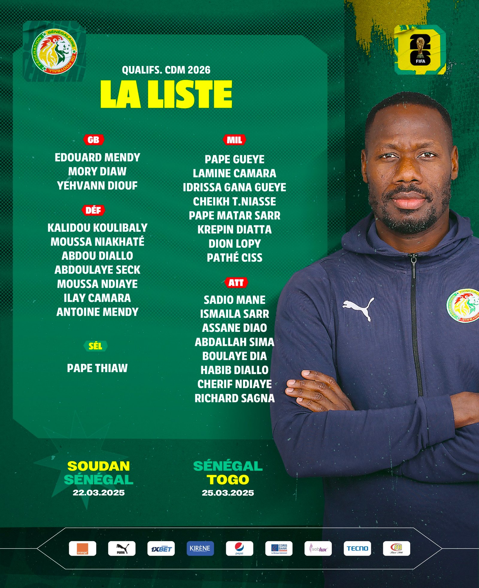 Ce jeudi 13 mars 2025, le Sénégal a dévoilé sa liste pour les matchs qualificatifs de la Coupe du monde 2026 contre le Soudan et le Togo les 22 et 25 mars (5e et 6e journées). Le sélectionneur Pape Thiaw a frappé fort pour ce premier rassemblement officiel de l’année 2025 avec une liste pleine de nouveautés. Pas moins de six joueurs honorent leur première convocation avec les Lions ! La liste compte également plusieurs forfaits de taille…