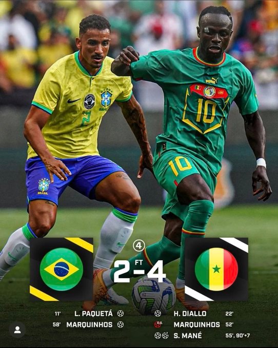 Lucas Paqueta et Marquinhos ont marqué pour le Brésil tandisque Habib Diallo, Marquinhos (CSC ), Sadio Mané auteur d’un doublé sont les buteurs du Sénégal. Avec cette victoire, le Sénégal devient la 1ère équipe à inscrire 4 buts lors d’un match contre le Brésil 🇧🇷 depuis l’Allemagne 🇩🇪 le 8 juillet 2014 (7). De plus, le Sénégal devient la 1ère sélection africaine de l’histoire à inscrire 4 buts contre le Brésil.