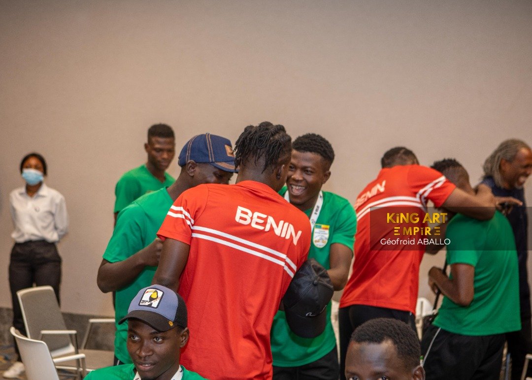Moment de célébration, de convivialité et de partage entre Écureuils Juniors, seniors et autorités sportives. C’était dans la soirée de ce mercredi 25 mai 2022 au Novotel Hôtel. En effet, comme promis, le Ministre des Sports, Oswald Homeky a reçu à dîner les Ecureuils U20 du Bénin fraîchement rentrés de Niamey où ils ont décroché la qualification à la Can Junior Egypte 2023. Instants de joie donc partagés également avec les Écureuils Seniors en regroupement dans le cadre des éliminatoires de la Can Côte d’Ivoire 2023, le président de fédération béninoise de football, Mathurin De Chacus, le conseiller technique du ministre des Sports, Jimmy Adjovi-Bocco, et bien d’autres.