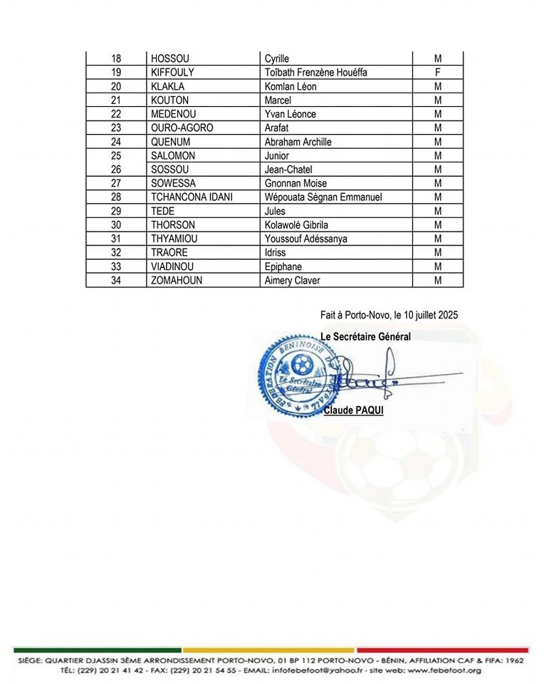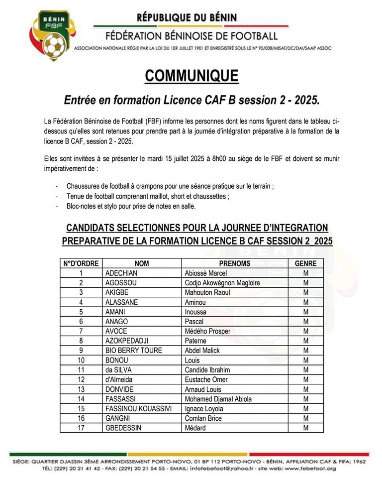 La Fédération Béninoise de Football (FBF) a publié, ce jeudi 10 juillet 2025, la liste des candidats retenus pour la journée d’intégration préparatoire à la formation Licence B CAF – Session 02 – 2025. Les candidats sélectionnés sont convoqués pour le mardi 15 juillet 2025 à 08h00 précises au siège de la FBF à Porto-Novo. Cette journée d’intégration constitue une étape obligatoire avant le démarrage de la session de formation. Les participants sont invités à se présenter munis de chaussures à crampons, d’une tenue complète de football (maillot, short, chaussettes), ainsi que d’un bloc-notes et d’un stylo pour la prise de notes.