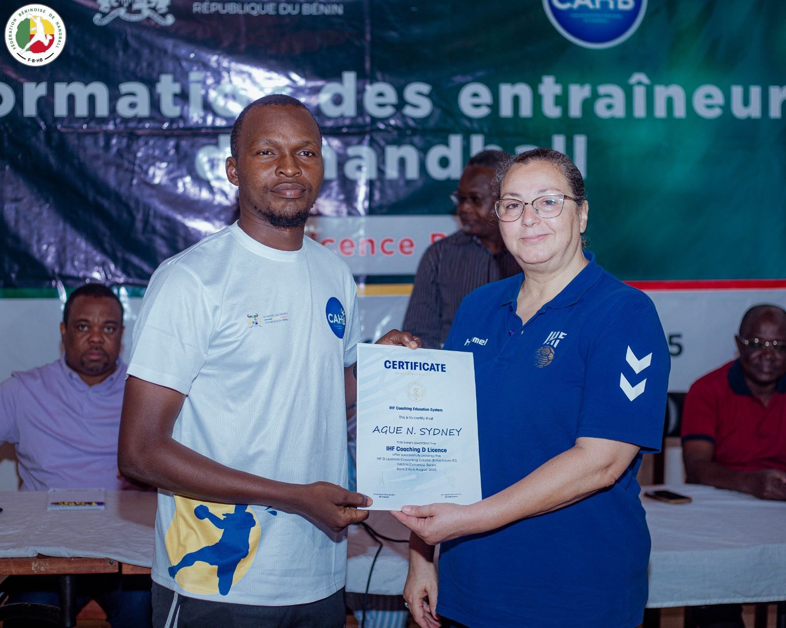 Le président de la Fédération, Sidikou Karimou, a quant à lui félicité les nouveaux diplômés. Ses mots : « Nous voici à la fin de la formation. félicitation à tous les stagiaires, nous n’avons eu aucun abandon. Si tout le monde a connaissance vous avez besoin d’aller sur le terrain pour démontrer que le ministère des sports, la fédération de handball, que l’IHF, la CAF ne se sont pas trompés. Pour nous l’objectif c’est la quantité de connaissance que vous avez reçu. Maintenant vous devez transmettre ces connaissances sur le terrain pour que nous le sentions au niveau de la discipline. Merci à l’experte, pour tout ce qu’elle fait pour le Bénin. Merci au ministère, pour la collaboration étroite. Nous allons nous organiser pour en tirer plus d’avantage. On a vu que le handball est très important, nous avons désormais 42 personnes que nous allons envoyer sur le terrain. Nous allons dormir un peu sur nos lauriers parce que nous savons que nous avons de la matière pour former une nouvelle génération. Le meilleur reste à venir. »