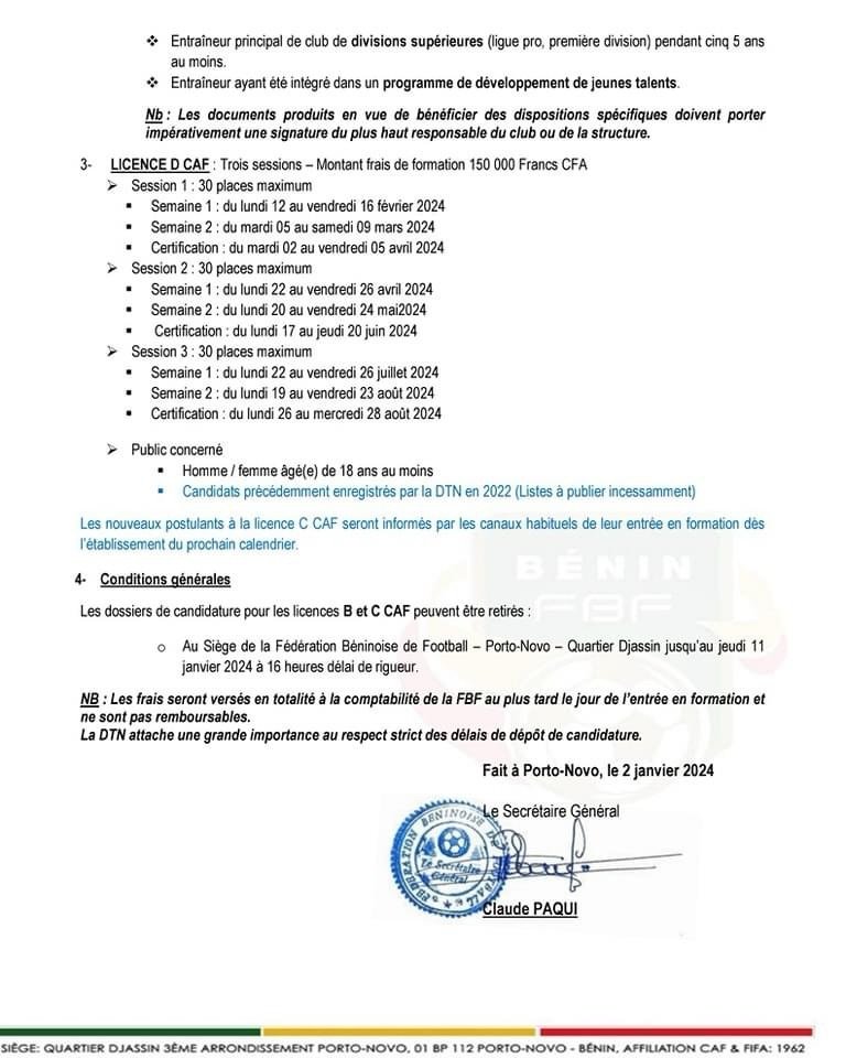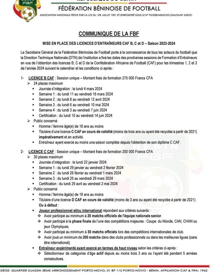 La Fédération Béninoise de Football (FBF) a annoncé ce mercredi 03 janvier 2024 les dates des prochaines sessions de formation d’entraîneurs pour les licences B, C et D de la Confédération Africaine de Football (CAF). Ces sessions de formation prennent comptent des trimestres 1, 2 et 3 de 2024. Les entraîneurs passionnés ont maintenant une opportunité incontournable pour perfectionner leurs compétences et élargir leur expertise.