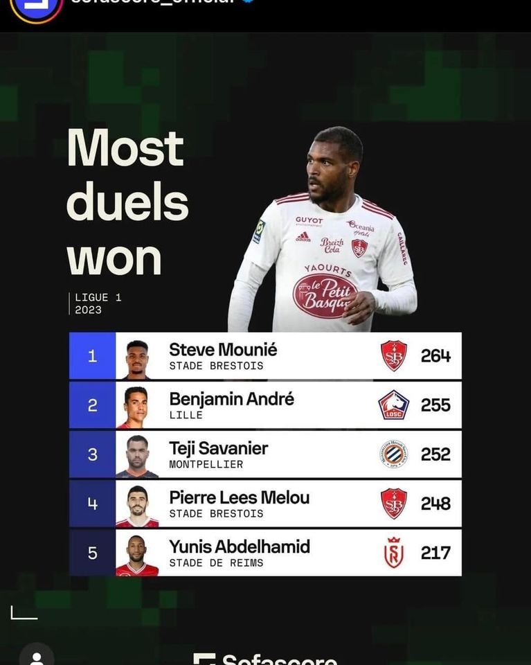 En cette année 2023, Steve Mounié s’est hissé au sommet d’un classement en Ligue 1 française en remportant le plus grand nombre de duels. Cette distinction, dévoilée par SOFASCORE, témoigne de la puissance et de l’impact de Mounié sur les terrains de football de l’élite française.